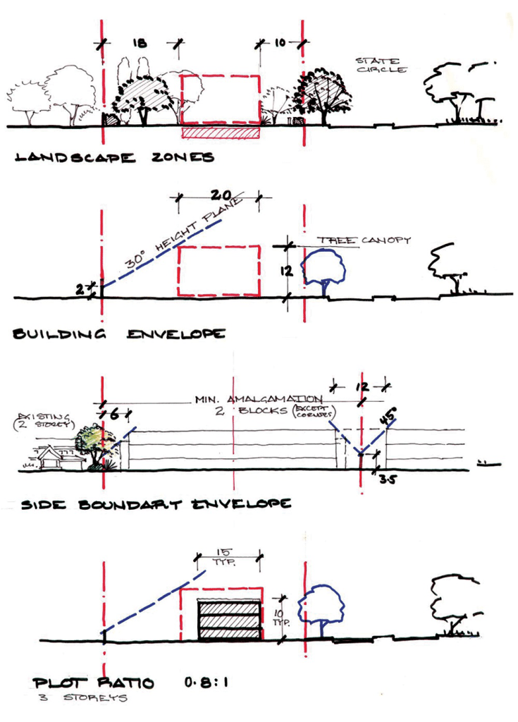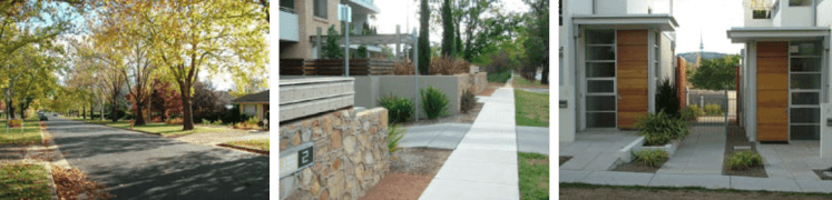 在當前澳洲的區域規劃(Territory Plan)裡,「街景」被定義為「一條街內的視覺組成,包括面向建築物之間的私人土地…包含街道兩側的建築線之間的土地範圍,其中包括視覺可見的:私人空間的建築物形式、建築物退縮空間、柵欄、樹木、綠化植栽、車道;以及公共空間的街道佈局、公用設施和街道家具。在這種結構之下,私人建築形式雖是重要的,但不會是主要的視覺元素。」