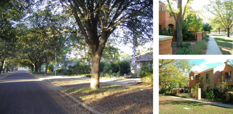 相較於典型的田園城市(Garden City)規劃,澳洲的城市規劃者延續其精神原則發展出另一套更適應當地條件的「花園郊區計畫」(Garden Suburb)。 這個計畫是1920年代時任聯邦首都都市規劃局長的約翰‧薩勒曼(John Sulman)所提出的,內容包括:提供充足的公共開放空間;街道採用單排或雙排植樹;住宅屋前寬闊自然帶(Natural Strips)[5]規劃;以及將屋前較窄的馬路及人行步道納入道路層級性結構(hierarchy of road)規劃中。