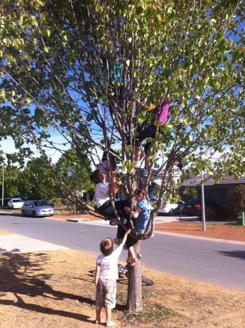 四季分明如詩如畫的澳洲花園社區;孩子們攀爬著街道上的由市政府在各家前Natural Strip上所種植的行道樹(Source: Janelee Li)