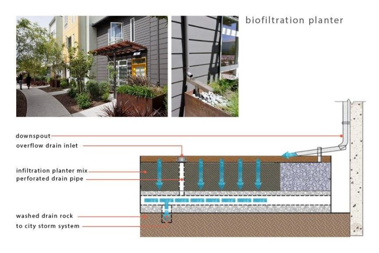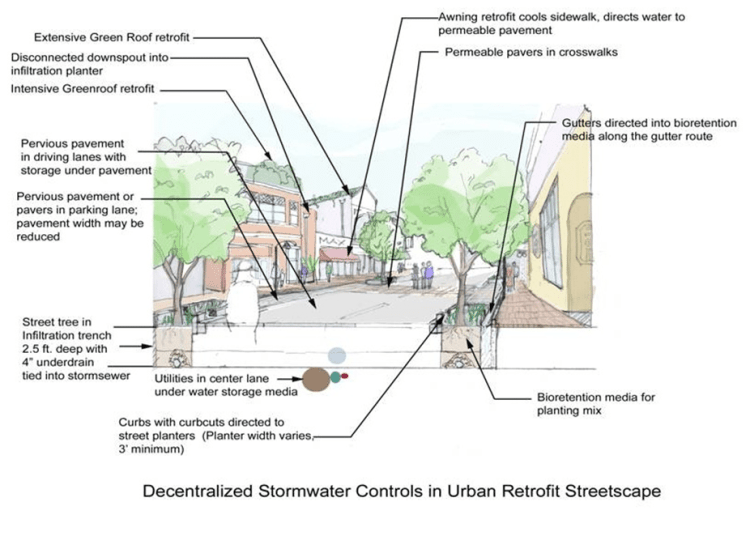 - 減緩都市地表逕流[2],讓地下水滲入生態水溝或窪地(Biogutter/ Bioswales),取代傳統的管道和排水系統(直接排放到汙水處理廠)