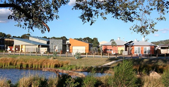 在正式推出這些法規前,ACT 政府首批示範社區由私人開發商與政府能源局及水利局(ACTEW and ActewAGL)在1985年後市中心郊區首批釋放的公有土地進行合作實驗。這批屋舍占地約17公頃,共計260間住宅,其中包含獨立房屋與連排透天街屋,每戶平均土地面積約500平方公尺(遠遠小於花園郊區土地地塊的平均值800 平方公尺)。其中推出全區使用省水的創新提案,除了贈送每戶免費的雨水收集水塔外,也開發地表逕流雨水調節設施至基地內所設計的溼地,同時分別設計出三棟不同造型的三星級被動式節源示範房屋,如照片所示(Three energy-efficient demonstration homes)。