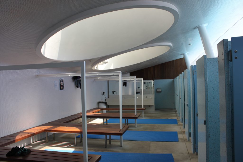 這座擁有 50 年悠久歷史的戶外游泳池,花費了 1,800 萬澳幣翻修,擁有九線道的戶外溫水游泳池,除了有雪梨境內最大的綠屋頂(100 ㎡)外,游泳池由外而內也有著許多設計師的巧妙安排。游泳池經過翻新後,兩側加入的無障礙坡道,讓年齡老邁或行走不便的族群也可以使用。巨大綠屋頂下為餐飲販售部及男女更衣室,室內空間增設了兩座巨型採光罩,為室內引進光線,而在接近屋頂處預留的大型帶狀通風口,更讓室內更衣沐浴空間不再充滿晦暗不明氣味。