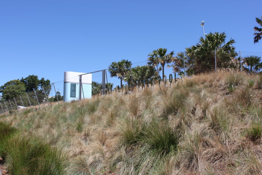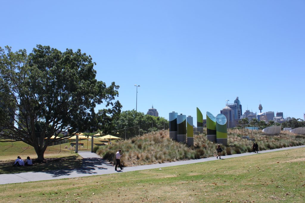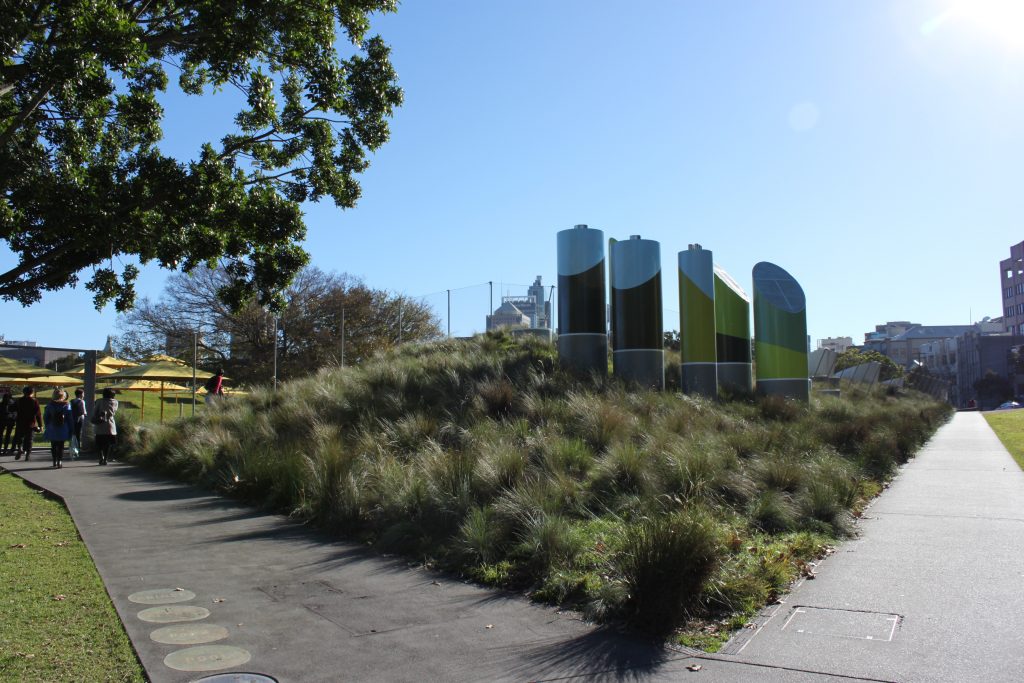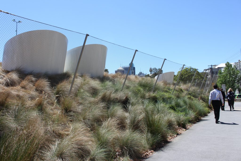 走在後站與公車專用道合併的人行道上,原有的舊矮墩後看得到雪梨中央商業區的天際線、新地標綠建築雙塔及部分中國城建物,是個舒服的大草坪。大斜面草坡挾帶著幾座頗為巧思的大煙囪,平面配置上採回力鏢狀的退縮法,由景觀設計師與園藝專家擔任顧問,先保留了基地幾棵既有大樹,簡單地留出漂亮的草坪,再以當地植生系統搭配具有淨水功能的耐旱植栽,種植出野草花園,使這座全雪梨公共空間面積最大的綠屋頂絲毫不讓人感到壓迫感。