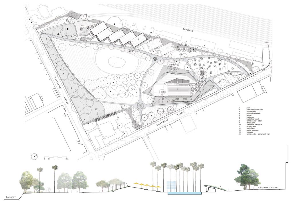 游泳池與公園裡的主要硬體設施物,由室內設計公司起家的女性建築師主持,與景觀建築師 Sue Barnsley 負責,色彩計畫交由相關公共藝術家共同開發,街燈遊具等公園設施物再與結構技師團隊商議,因此產生了一座由市府單位到設計師及市民,共同感到榮譽的城市新基準案例(benchmark)。此案更說明了擁有綜合功能城市中心的當代綠地公園,能夠在簡單中又兼具當代城市美感的設計下顧及綠能環保。